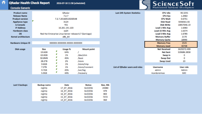 In my case, we are planning to expand the scope of servers monitored by QRadar, so I wanted to understand if we would need any hardware upgrades. For testing purposes, I disabled the log collection of 30 Windows servers that were currently being monitored and I noticed that the RAM memory usage reduced by around 5% (see images below). Obviously, this number will vary according to the server usage, but this test gave me a rough estimation that for each 30 servers my RAM memory usage will increase around 5%. So with the help of the HCF plugin, I was able to identify hardware upgrades to accommodate the monitoring of new servers, avoiding system outages due to lack of resources during the scope expansion.